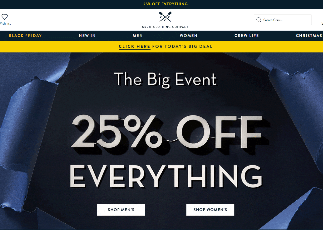 Black Friday Big Deal: Get 25% OFF on all products at Crew Clothing.